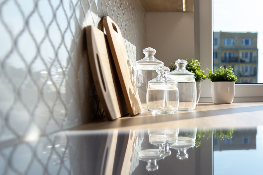 Lekki powiew Grecji, to właśnie można odczuć po wejściu do tego mieszkania. Na wejściu stworzyliśmy przestronną kuchnię ze wszystkimi niezbędnymi sprzętami z pięknymi frezowanymi szafkami w kolorze błękitu. Dalej łazienka z ogromnym prysznicem i bardzo dużą ilością szafek. W dużym pokoju poszliśmy w granat, a na ścianie za kanapą tapeta, która się świetnie wpisuje w całość.